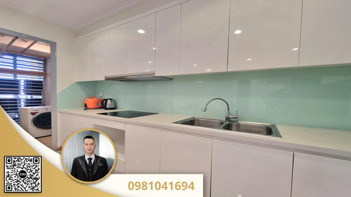 Phòng tắm và bếp: Khu vực bếp được trang bị tủ bếp trên dưới màu trắng bóng, sạch sẽ, có sẵn bếp điện và bồn rửa. Phòng tắm hiện đại, ốp gạch sáng màu và có cabin tắm đứng bằng kính.