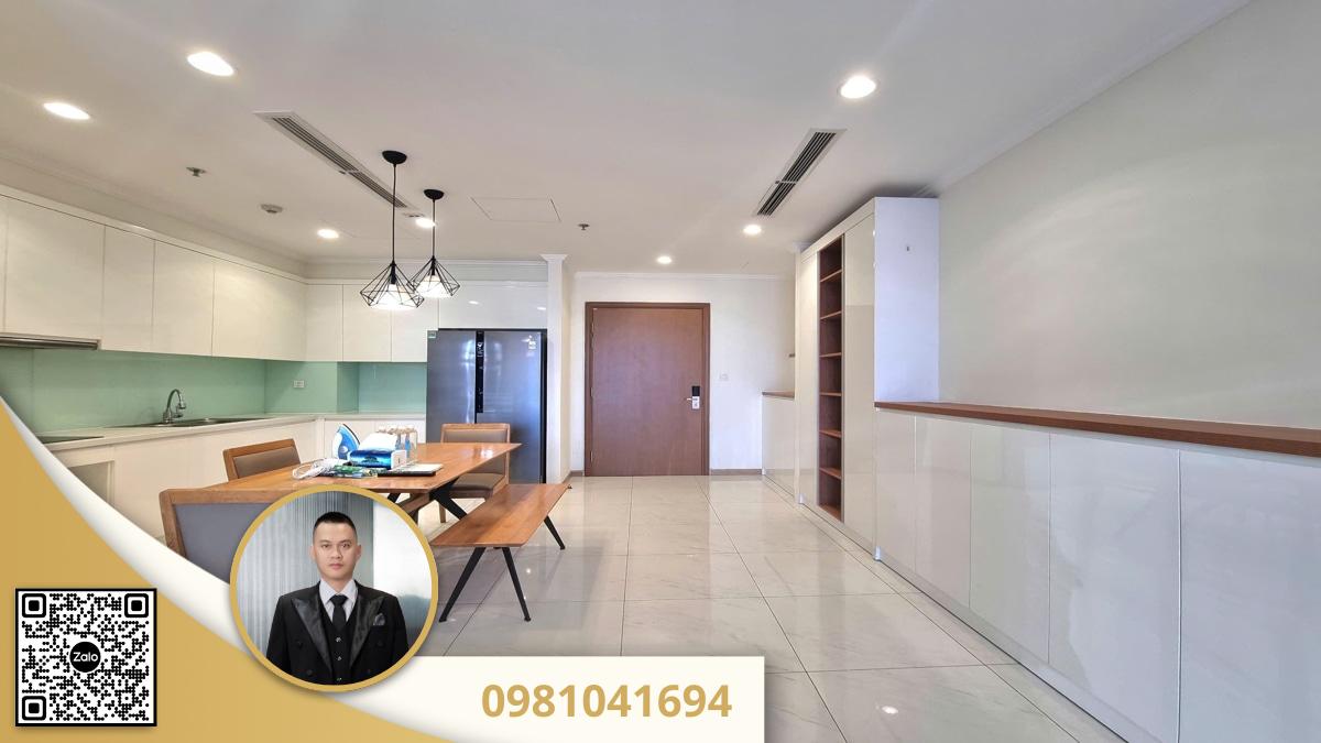 Không gian và thiết kế: Căn hộ được thiết kế theo phong cách hiện đại với tông màu trắng và gỗ sáng làm chủ đạo, tạo cảm giác rộng rãi và ấm cúng. Tường được trang trí bằng các đường phào chỉ tân cổ điển, mang lại vẻ sang trọng, tinh tế.