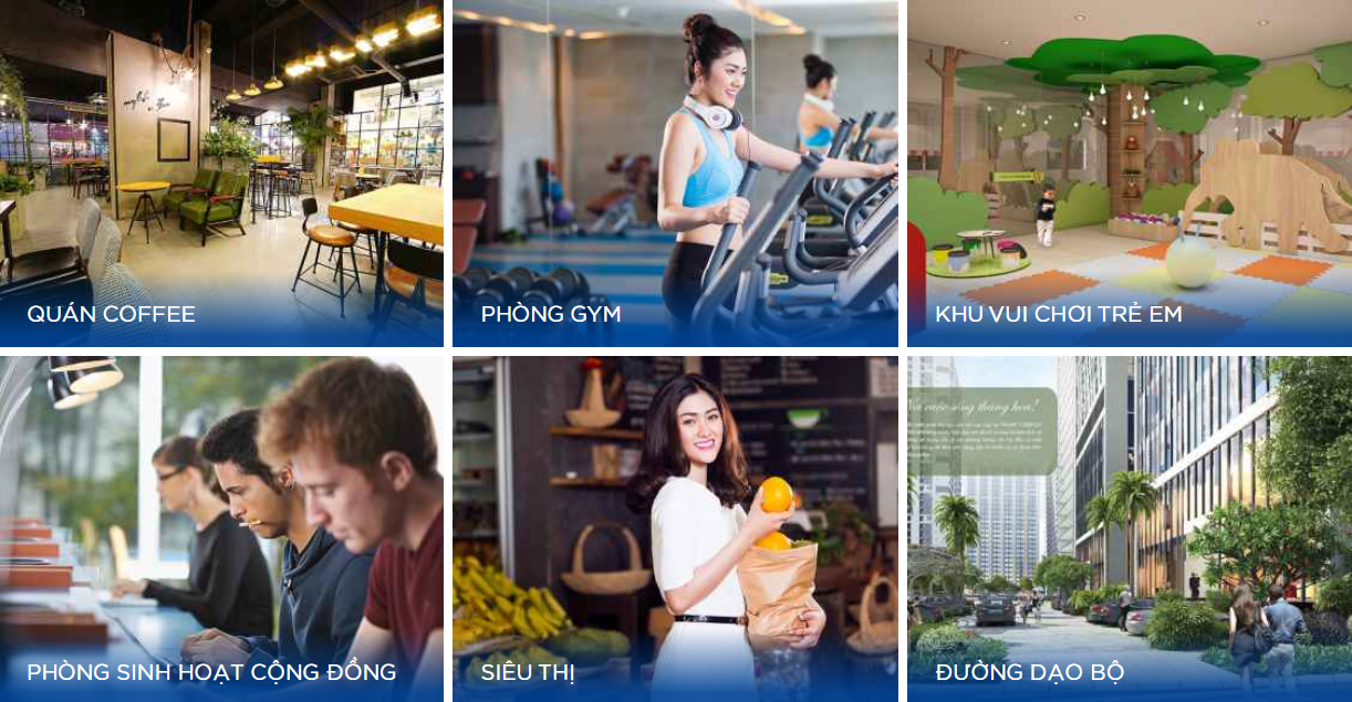 - Hệ thống tiện ích 3 tầng: trung tâm thương mại, phòng gym, khu vui chơi trẻ em