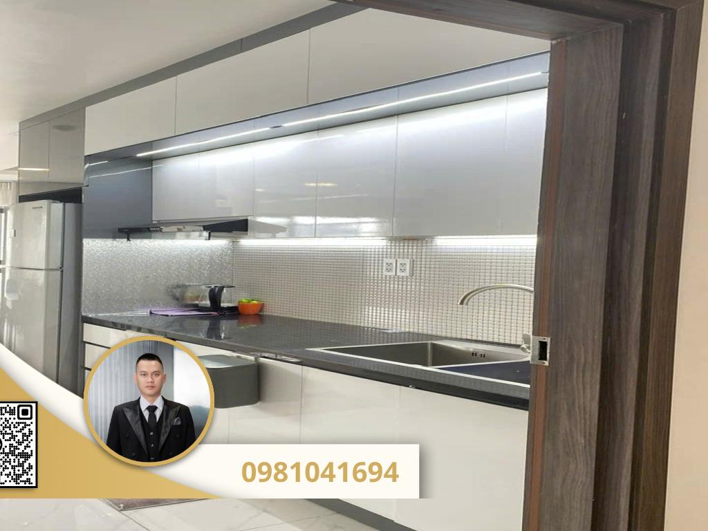 - Bếp thiết kế hiện đại với tủ bếp màu trắng và mặt đá xám