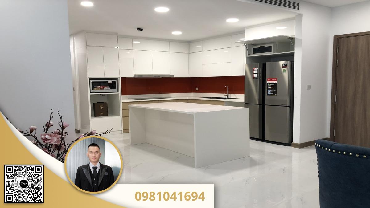 - Tủ bếp: Tủ bếp trắng bóng với đảo bếp trung tâm