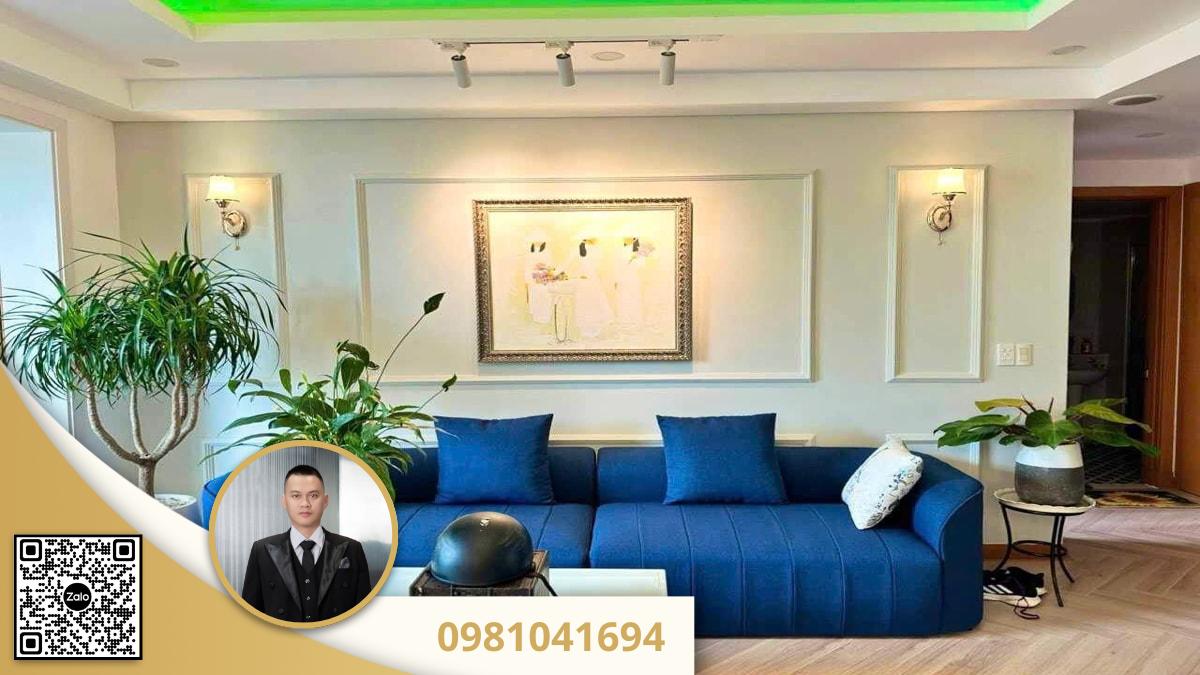 - Phòng khách rộng rãi với sofa màu xanh navy sang trọng