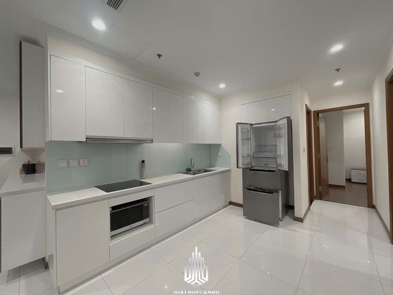 • Bếp: Tủ bếp tông trắng-xám, tủ lạnh side-by-side, máy rửa bát